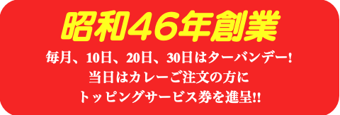 毎月10日、20日、30日は「ターバンデー」! カレーご注文の方に、次回以降使えるトッピングサービス券を進呈いたします。お見逃しなく!